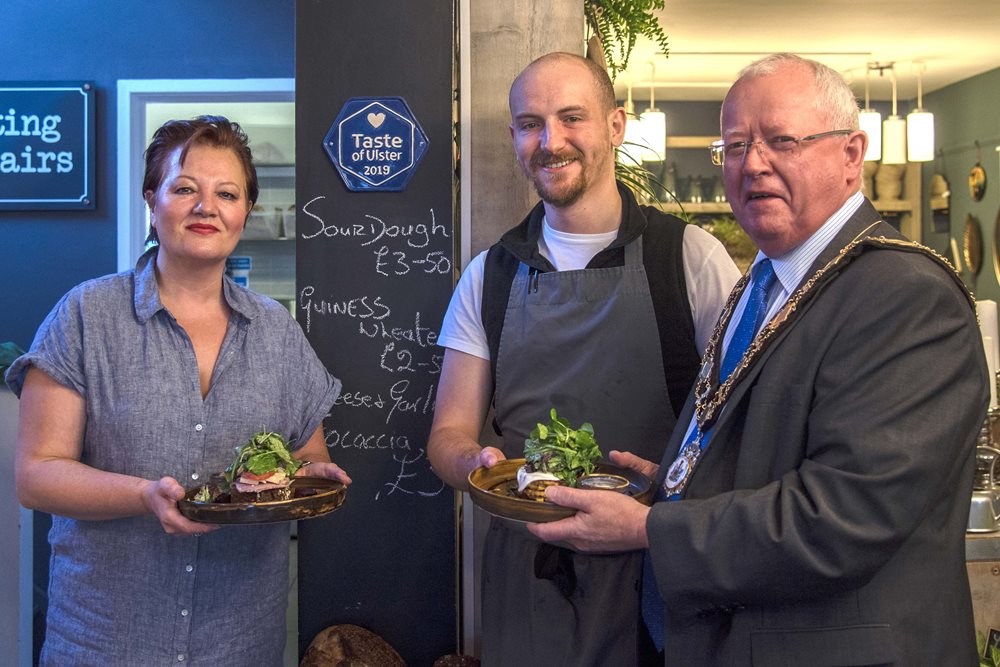 Mayor of Antrim and Newtownabbey, Alderman John Smyth, recently congratulated Teresa Murray, owner of Linen and Latte, Portland Avenue, Glengormley and her son, Matthew Murray, chef at Linen and Latte, on being the first business in Glengormley to be awarded a ‘Taste of Ulster’ Plaque by Food NI. #tastethegreatness