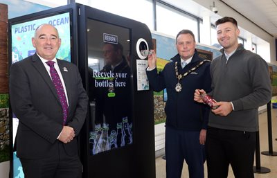 Mayor of Antrim and Newtownabbey Councillor Mark Cooper MBE at the launch of Belfast International Airport’s innovative Reverse Vending Machines. Shown (L-R): Antrim and Newtownabbey Borough Council Director of Sustainability Michael Laverty, Mayor Cllr. Cooper, Belfast International Airport Environment and Sustainability Officer Daniel Perry.