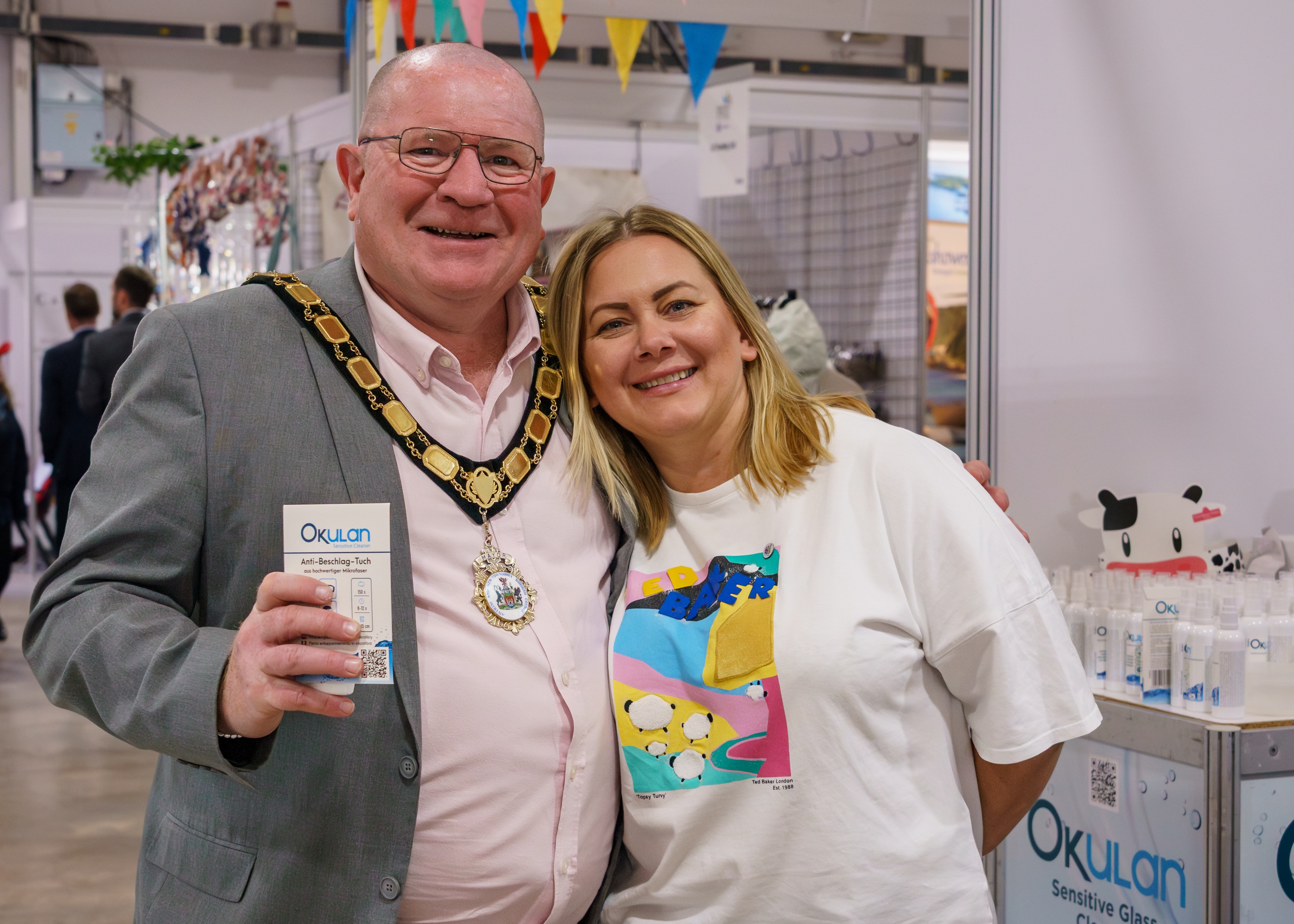 The Mayor, Councillor Neil Kelly, at the Okulan Sensitive Glass Cleaner stand