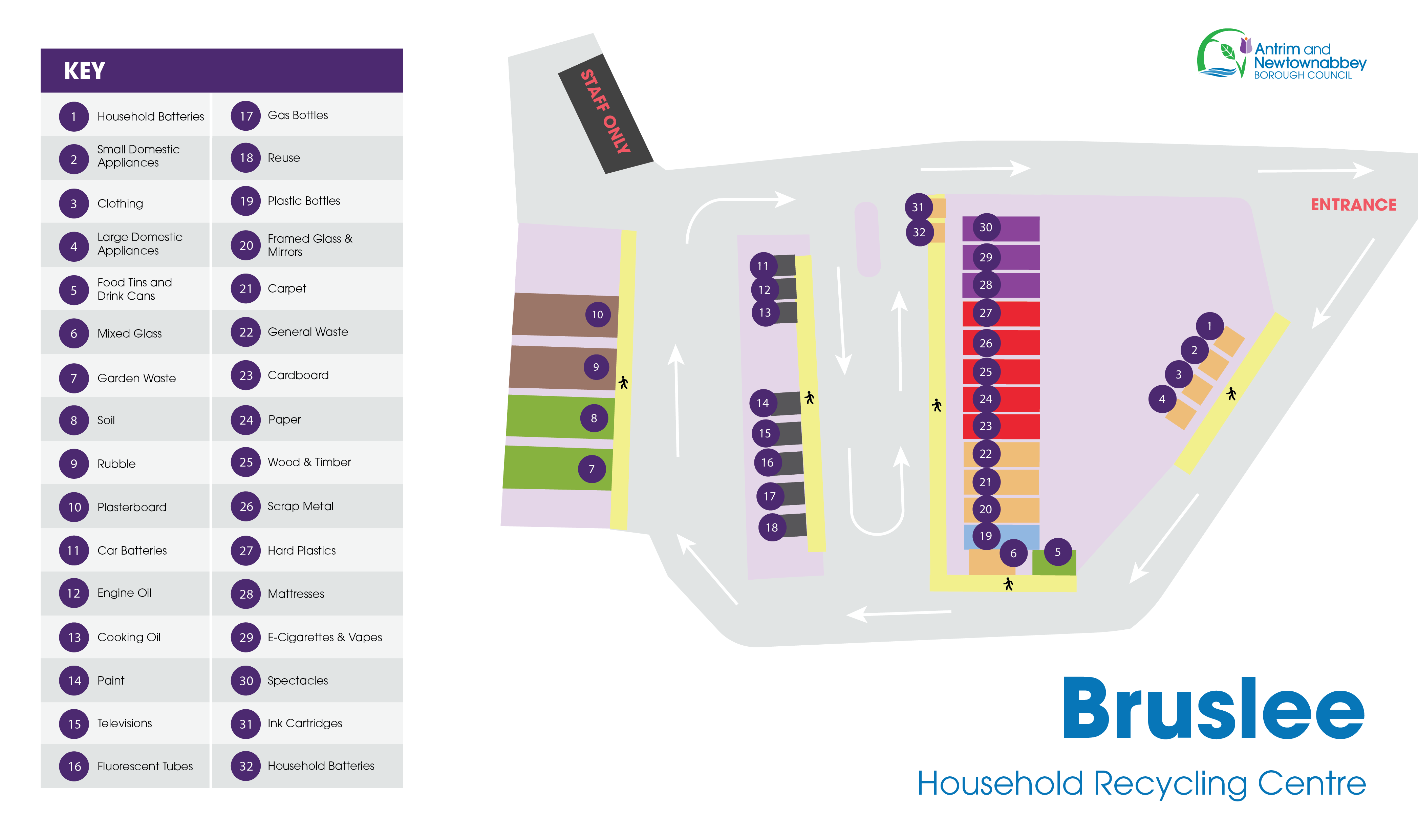 The following items can be recycled at Bruslee Recycling Centre: